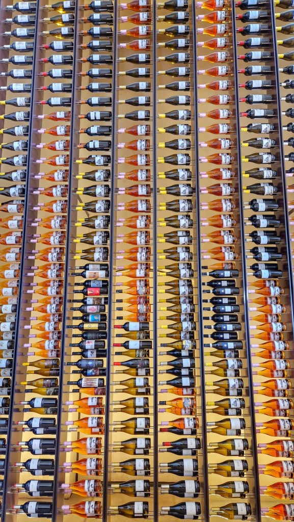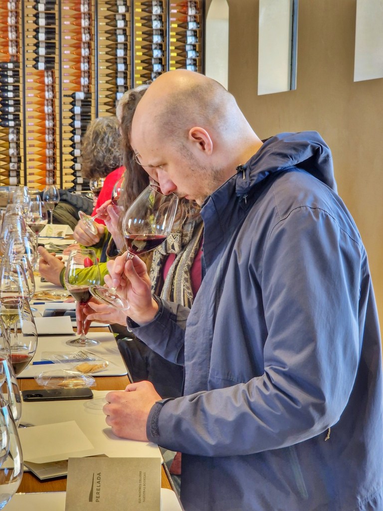 Acabada la magnífica visita, agafem novament l’ascensor i pugem directament a la sala de tasts. Una gran i austera sala, amb una paret plena d’ampolles de vi Perelada, i unes llargues taules, degudament vestides per al tast, fan de la sala un lloc ideal i agraciat per tastar els fantàstics vins Perelada