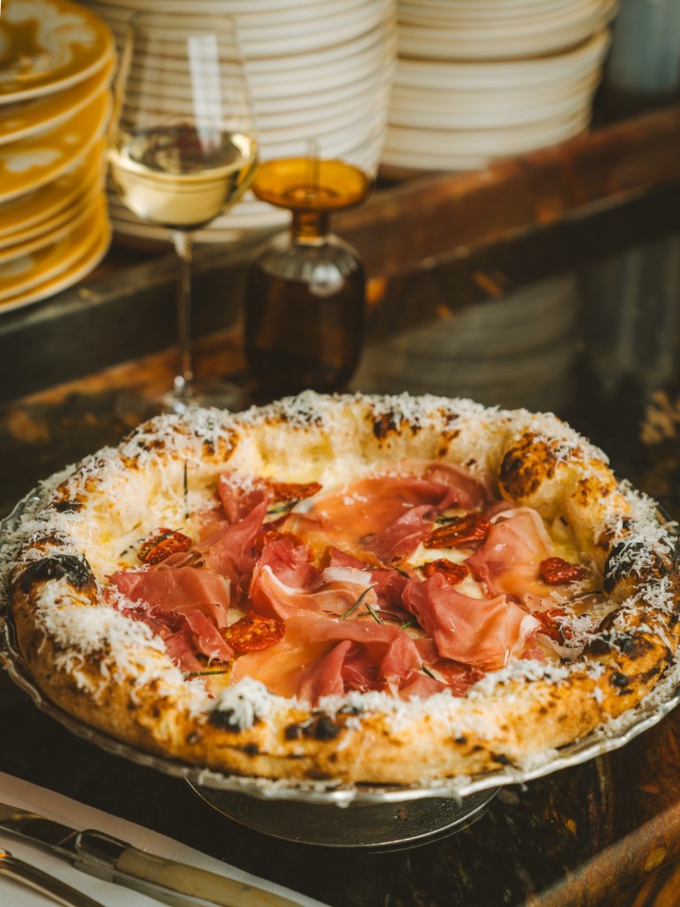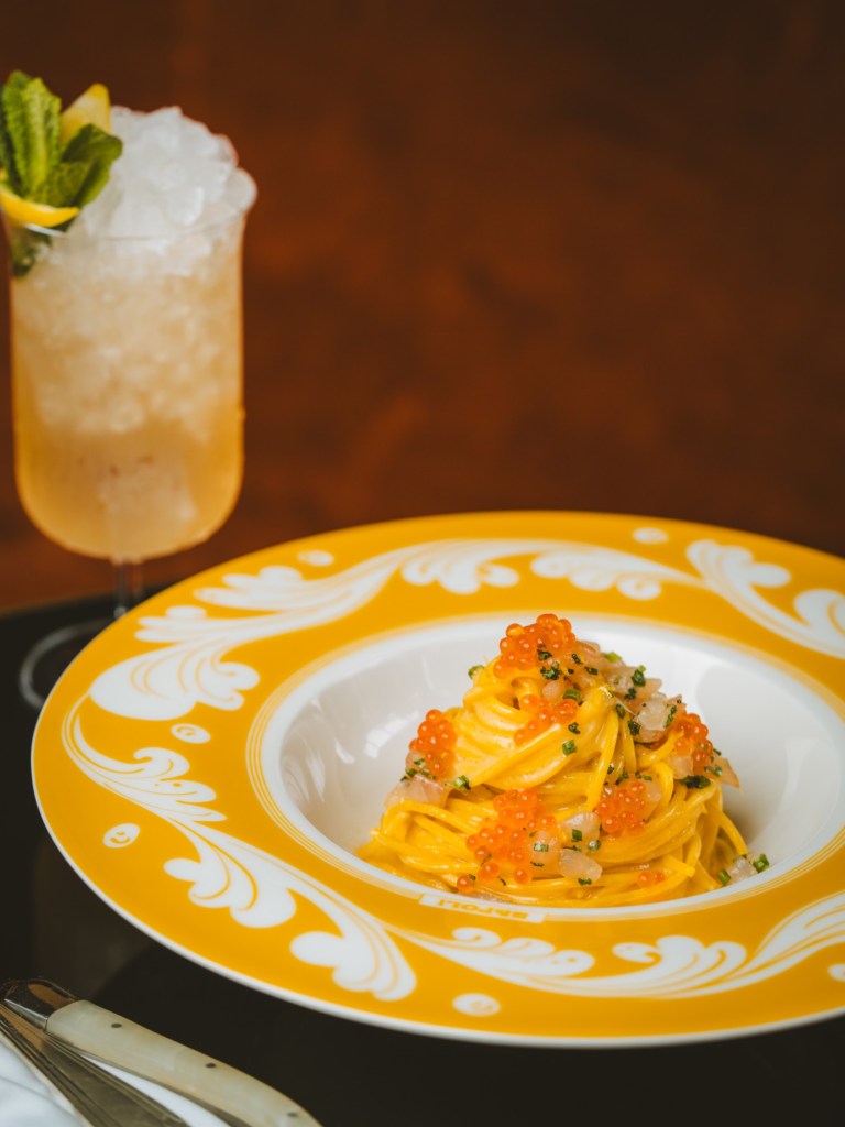 Tanto dispendio estético quedaría cojo si la carta y la comida no fueran igual de ambiciosas. “Todo está hecho en casa, no tenemos ninguna cocina central. Esta es una de las señas de identidad de Big Mamma: que cada restaurante lo cocina todo en casa”, me cuenta Tigrane Seydoux, fundador del grupo. Eso incluye la pasta fresca y la pasta seca, la pasta de las pizzas, los helados, los postres y el pan, claro. ¿Qué pedir? Se hace difícil, por la extensión y suculencia de la carta. Desde una pasta rellena–los casoncelli de bogavante con beurre blanc y tartar de gamba rozan la obscenidad–, pasando por los más conocidos espaguetis carbonara –con un toque de trufa y servidos en una rueda de Pecorino–, cada plato lleva el sello de la suculencia y el lujo impreso en su impecable preparación. Desde los más sencillos –los espaguetis a la norma, en su origen pasta con verduras– hasta un apartado de pizzas, cada una con retruécano gourmet. La que más, una pizza de carpaccio de gamba roja con esquirlas de pistacho.
