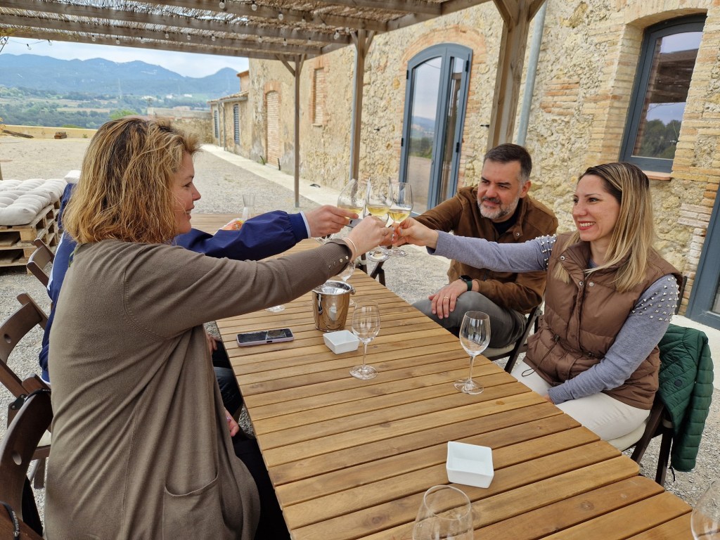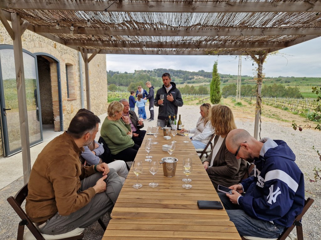 Prosseguim fins arribar a la recepció i sala de botes, per sortir a l’exterior i sota d’un porxo de fusta i una llarga taula ja preparada, efectuar el tast increïble de dos escumosos i dos vins tranquils (un de Muscàdia)