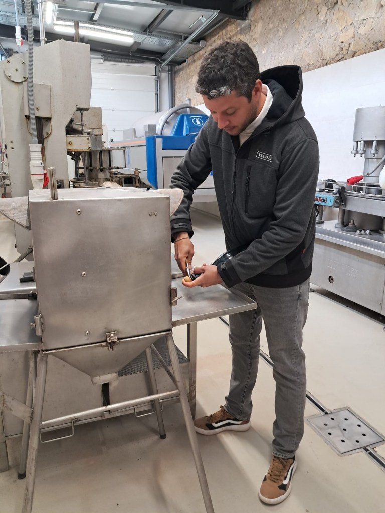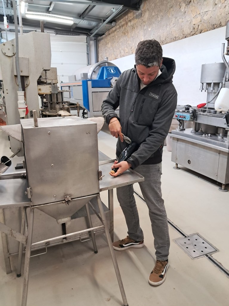 Seguim fins arribar al lloc que hi ha la maquinària final, com a degollament, emplenat etiquetatge etc. Dir-vos que el degollament d’aquestes 20.000 ampolles que us hem indicat que fa el gir l’Eduard, també fa el degollament manual una a una, tot un art que vam poder gaudir en una demostració que ens va fer.