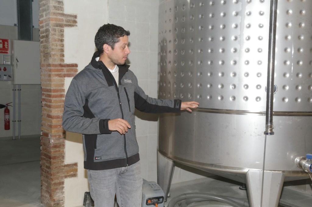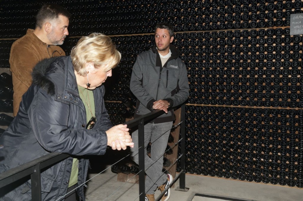 Passem a la sala dels dipòsits. d’inox i posteriorment a la sala on reposen les ampolles de vi tranquil i vi escumós que com a mínim ha d´estar 18 mesos. També podem observar tres cups antics, que han conservat i reformat i actualment dormen les ampolles de molt llargues, llargues criances. Així mateix, podem observar uns pupitres de formigó i altres de fusta que són l’estructura on es col·loquen les ampolles per facilitar ‘el remogut’, i que l’Eduard, realitza el gir de les mateixes diàriament i elaboren unes 20.000 ampolles més o menys, anualment, Imagineu-vos.