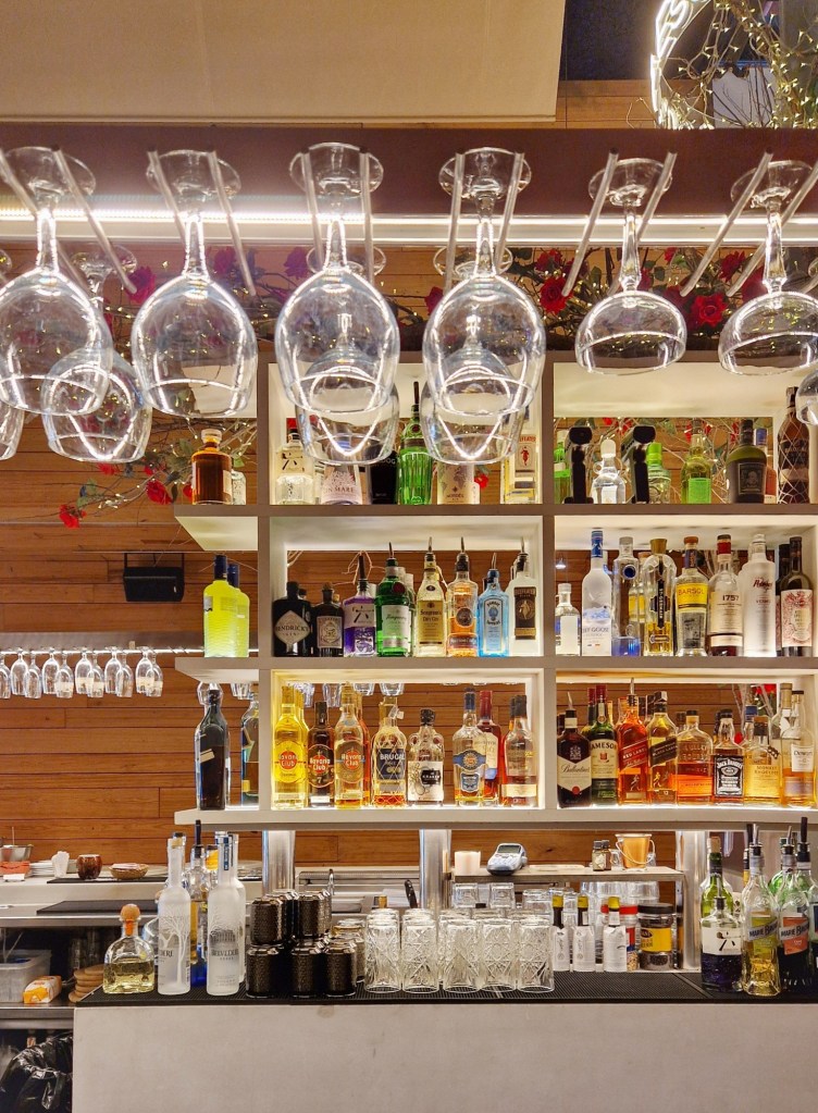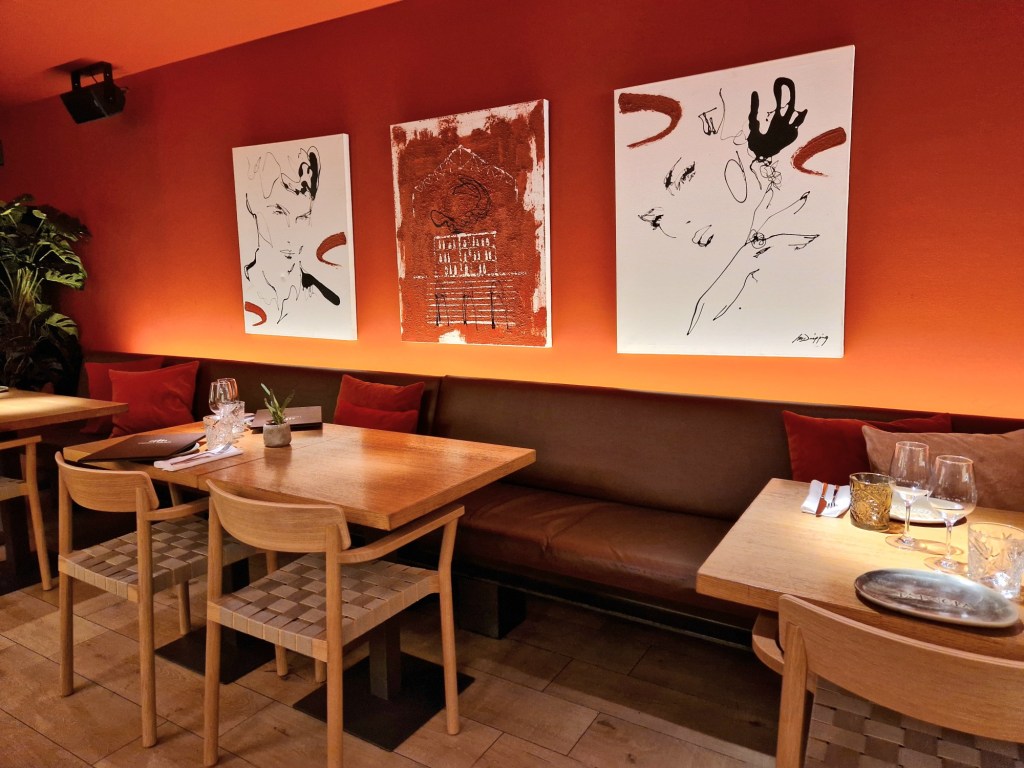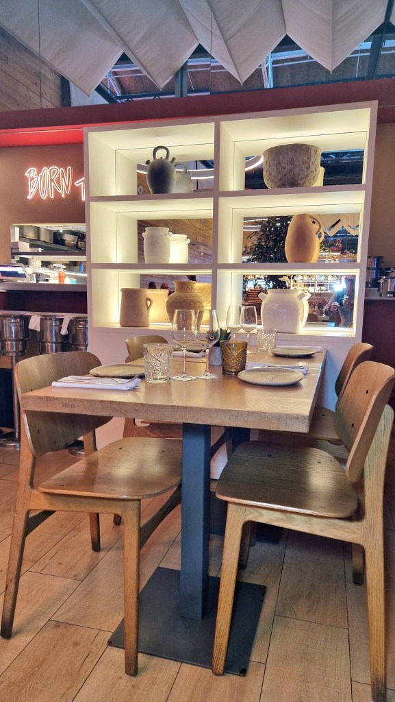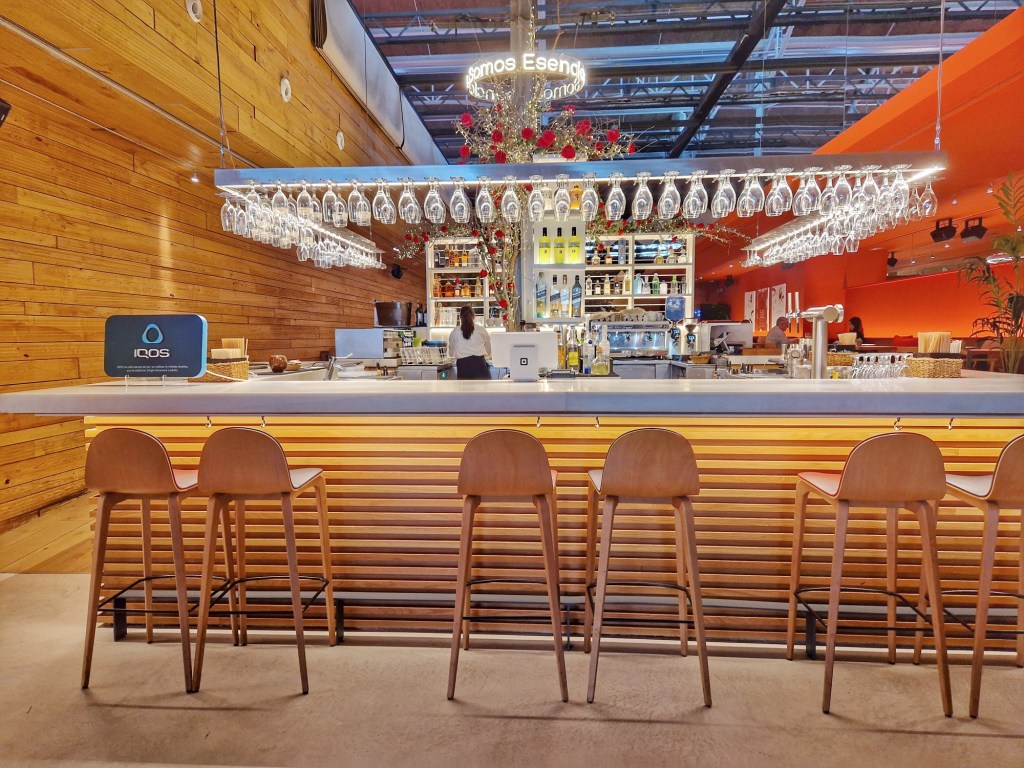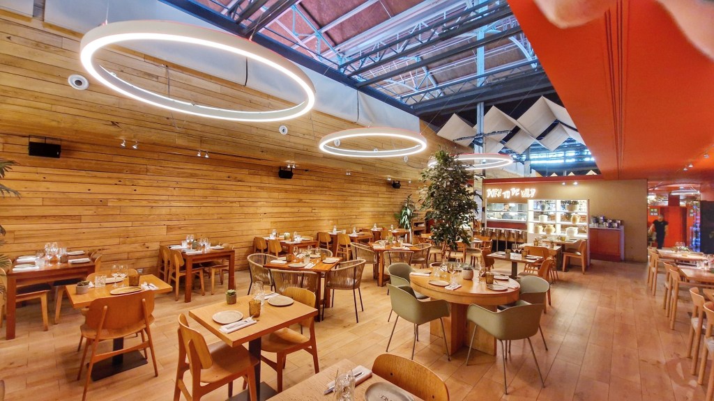 El restaurante, adyacente a los puestos, es una sala alargada con dos espacios diferenciados; la barra de cócteles separa las mesas informales de la derecha de la sala principal de la izquierda y la cocina abierta del fondo. El ambiente es tranquilo y la madera y los colores cálidos hacen que el espacio sea elegante, en un entorno original, romántico, actual, moderno y fashion ideal para disfrutar de su cocina ,cocteleria y buena música