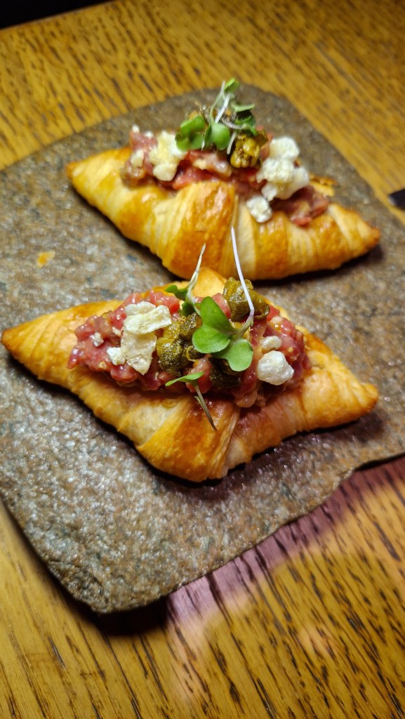 MINI CROASANT CON UN TOQUE DE ANGUILA AHUMADA Y CRUJIENTE DE PALOMITAS DE CERDO, CON ALCAPARRAS FRITAS.