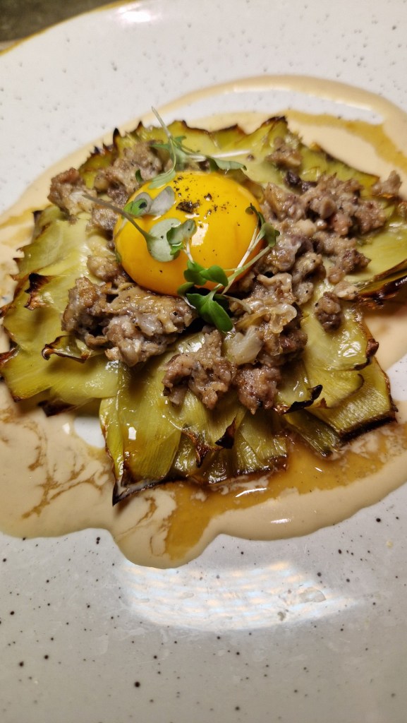 FLOR DE ALCACHOFA CONFITADA CON ACEITE DE OLIVA EXTRA VIRGEN, ACOMPAÑADA DE BUTIFARRA DEL PEROL, UNA YEMA CURADA Y SALSA DE FOIE