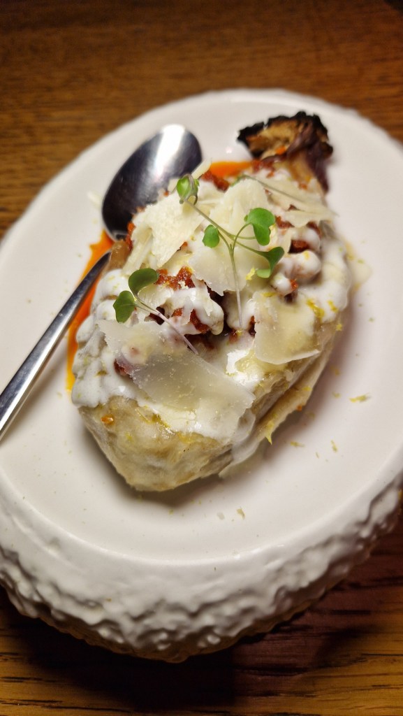 BERENGENA A LA BRASA ACOMPAÑADA DE SOBRASADA DE MENORCA, CON SALSA DE QUESO PARMESANO UN TOQUE DUCE CON MIEL Y AROMAS CÍTRICOS