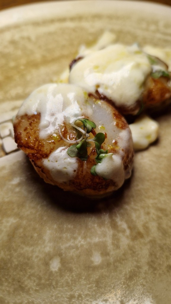 VIEIRA A LA PLANCHA CON UNA PARMETIER DE PATATA, ACOMPAÑADO CON SALSA DE PUERRO CON ACEITE DE HIERBAS