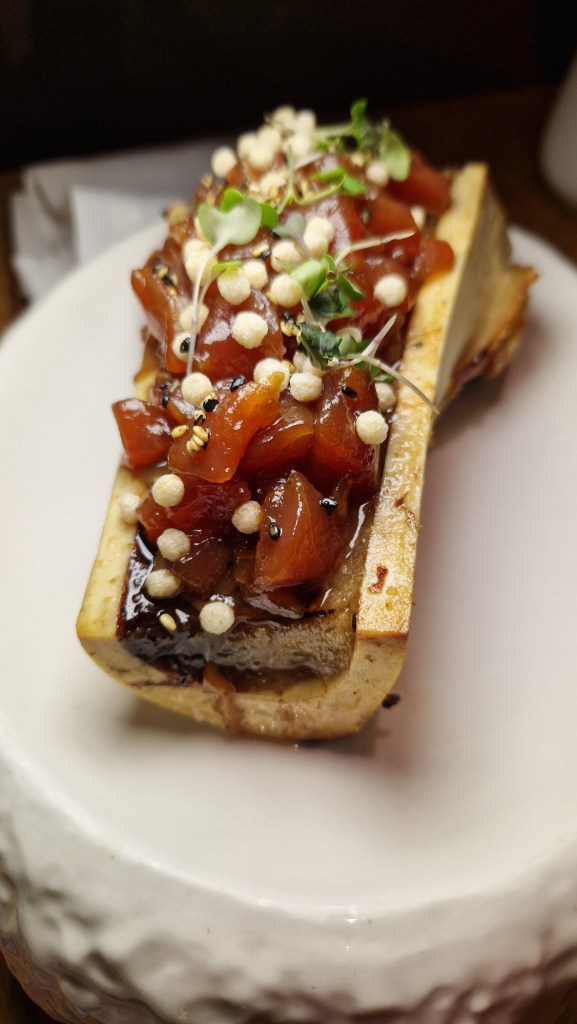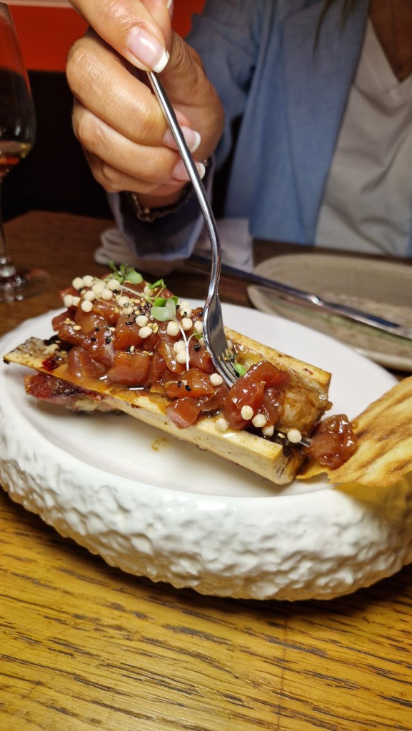 TARTAR DE ATUN ROJO SOBRE TUETANO DE TERNERA, MARINADO CON UNA SALSA CONSUL, CRUJIENTE DE ARROZ INFLADO Y SESAMO CARAMELIZADO, ACOMPAÑADO CON PAN CARASAU