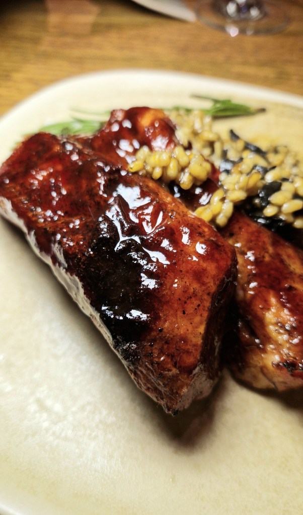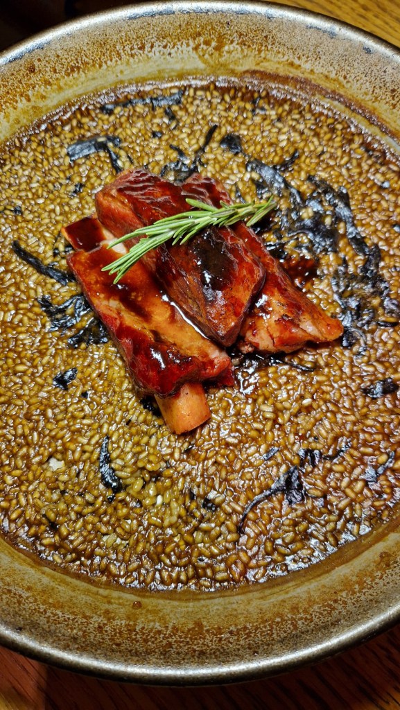 ARROZ DE COSTILLA A BAJA TEMPERATURA CON TROMPETAS DE LA MUERTE. (Costilla cocinada a baja temperatura durante 12h, con reducción de vino, su propio jugo y caramelizada) EXPECTACULAR!!