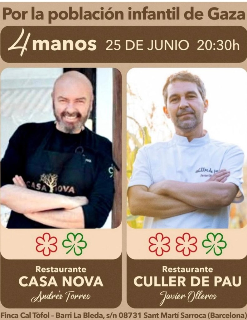 Andrés Torres, chef y propietario del restaurante Casa Nova (1 Estrella Michelin y 1 Estrella Verde) y presidente de la ONG Global Humanitaria, ha anunciado que organizará una serie de cenas solidarias empezando el próximo 25 de junio a las 20:00 horas junto a Javier Olleros, chef galardonado y propietario de Culler de Pau (2 Estrellas Michelin y 1 Estrella Verde), con un firme compromiso humanitario, la recaudación íntegra será destinada a apoyar a los niños afectados por el conflicto bélico en Gaza.