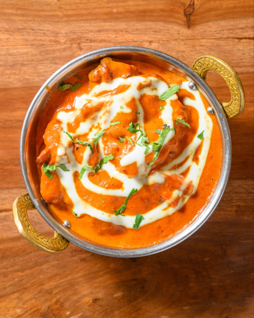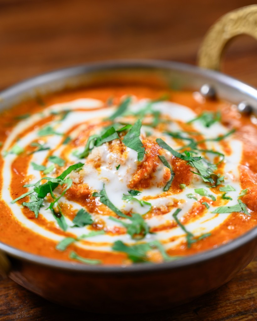 El curry estrella de Mayura, suave y aromático. Un plato delicado, untuoso y lleno de sabor, ideal para acompañar con pan naan o arroz basmati. Para 2-3 raciones, se marinan 300 g de muslos de pollo con 30 g de yogur, 5 g de ajo, 5 g de jengibre, 1 g de cúrcuma, 3 g de masala para carne y sal al gusto durante 4 horas. Se asa el pollo a 220 °C, se deshuesa y se corta. En una cazuela se calientan 300 g de salsa base con 75 g de mantequilla, 120 g de nata y 7 g de azúcar. Se añade el pollo y se cocina durante 4-5 minutos. Se sirve con un poco más de nata y cilantro fresco picado.