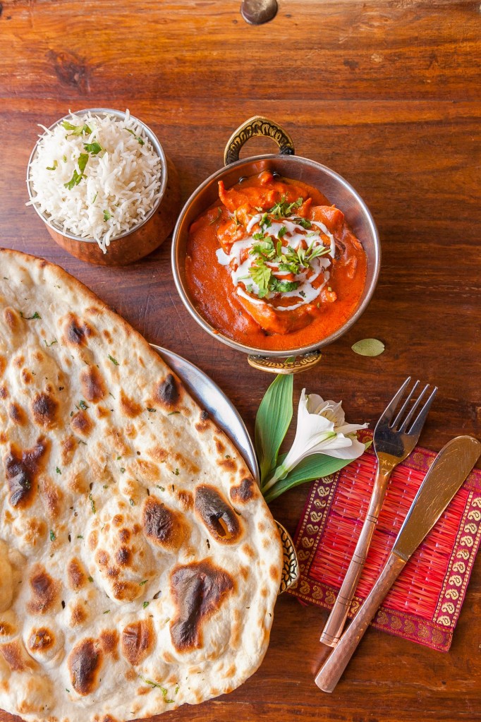 Un plato que habla de recuerdos y tradición. Para 2-3 raciones, se marina 300 g de pechuga de pollo durante 4 horas con 5 g de ajo, 5 g de jengibre, 0,5 g de cúrcuma, 1 g de cardamomo, 1 g de pimienta blanca, 20 g de nata, 5 g de vinagre blanco, sal al gusto y 10 g de aceite de oliva. Luego se asa a 220 °C o en plancha. Mientras, se calientan 300 g de la salsa base con 20 g de mantequilla, 100 g de nata, 20 g de pasta de anacardos y 3 g de almendra molida. Se incorpora el pollo y se cocina todo junto durante 3-4 minutos. Se sirve con un chorro de nata, cilantro fresco y anacardo molido.