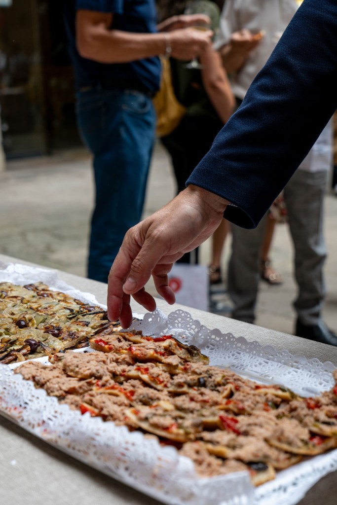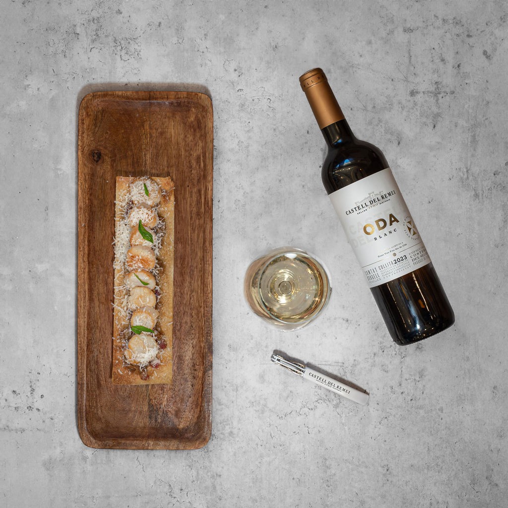 3. David Florensa de Castell del Remei de Penelles ofereix Coca de la Noguera amb vieires i pernil ibèric que acompanyen el vi Oda Blanc 2023 de Castel del Remei presentat per l’enòloga Gemma Plaza.