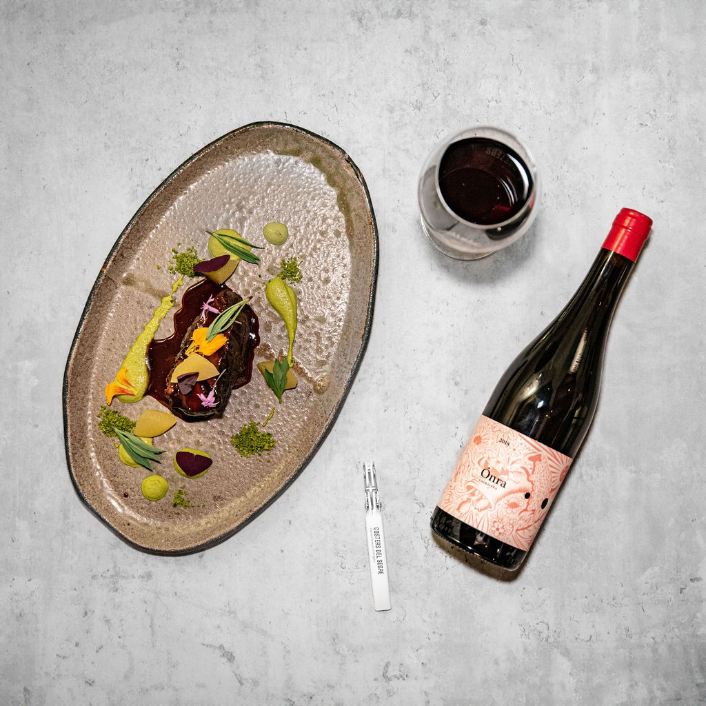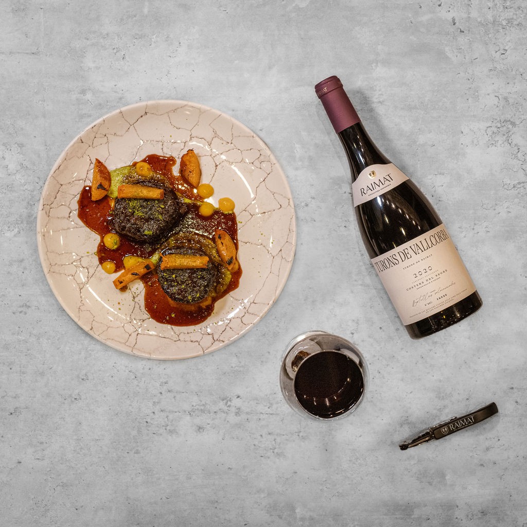 6. Francesc Molins i Ashot Gevorgyan de Cal Xirricló de Balaguer cuina Cua de vedella de la Noguera amb albercocs a la brasa i festucs que casen amb el vi negre Turons de Vallcorba 2020 de Raimat, presentat per la sommelier Laia Balcells.