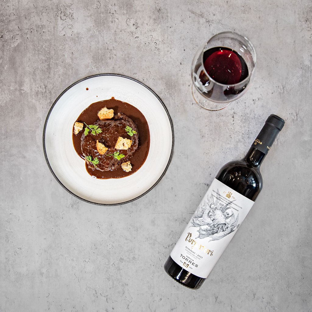 8. Salvador Trabalón del Saroa de Lleida elabora una Galta de vedella de Cal Massot guisada amb xocolata a la pedra i carquinyoli que marida amb el vi Purgatori 2022 de Família Torres presentat per l’enòleg David Barriche.