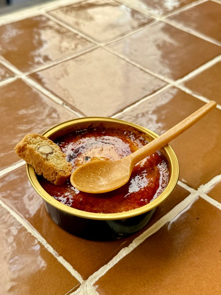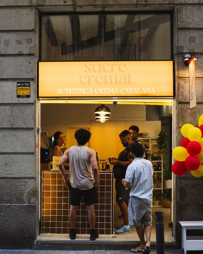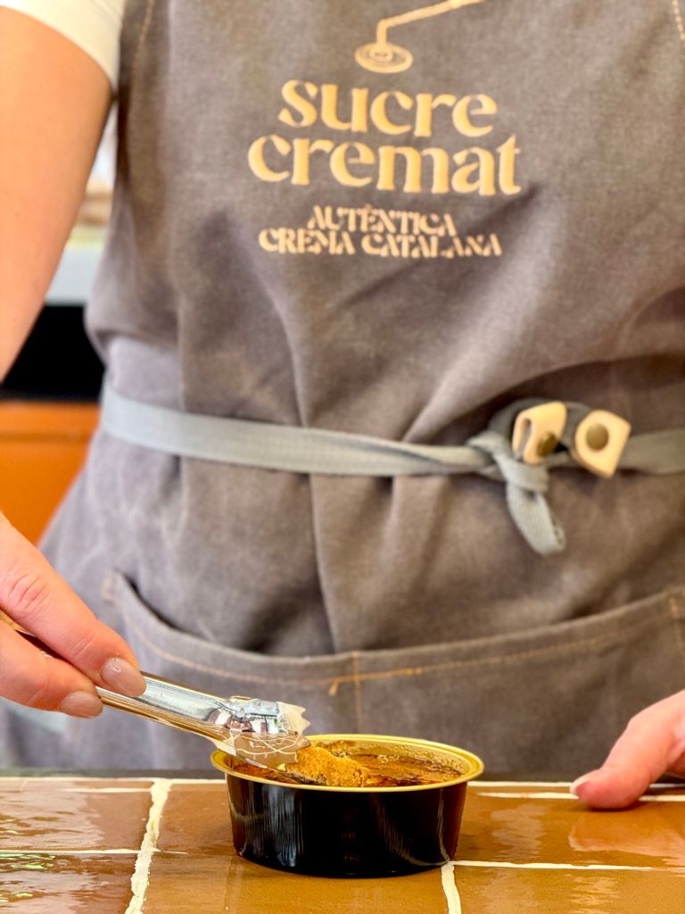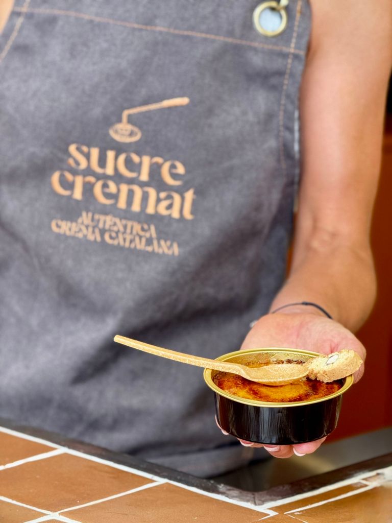 Oberta aquest juliol al carrer Canvis Vells nº2 de Barcelona, a tocar de la magnífica Santa Maria del Mar, Sucre Cremat és un petit establiment que, efectivament, vol retre homenatge a la memòria gustativa dels catalans i catalanes amb una proposta monogràfica, sense artificis ni distraccions. I que vol, també, apropar a visitants i estrangers una petita mostra de la cuina catalana més dolça en un format modern, divertit i “per emportar”. Perquè a Sucre Cremat només s’ofereixen terrines de crema catalana (de 150 ml i a un preu de 5 €) per emportar i assaborir al moment o al cap de pocs minuts, per a gaudir al màxim de la textura cruixent del sucre acabat de cremat, mentre deixa una increïble olor de caramel pel carrer del Born.