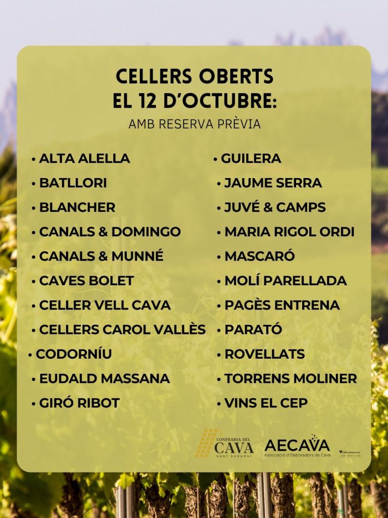 El proper 12 d’octubre de 2025, coincidint amb la festivitat del Pilar, torna una de les propostes enoturístiques més consolidades del nostre territori: la Jornada de Portes Obertes dels cellers elaboradors de cava. Organitzada per la Confraria del Cava amb el suport de l’associació d’elaboradors AECAVA, la jornada convida el públic a endinsar-se en el món del cava de la mà dels seus protagonistes.