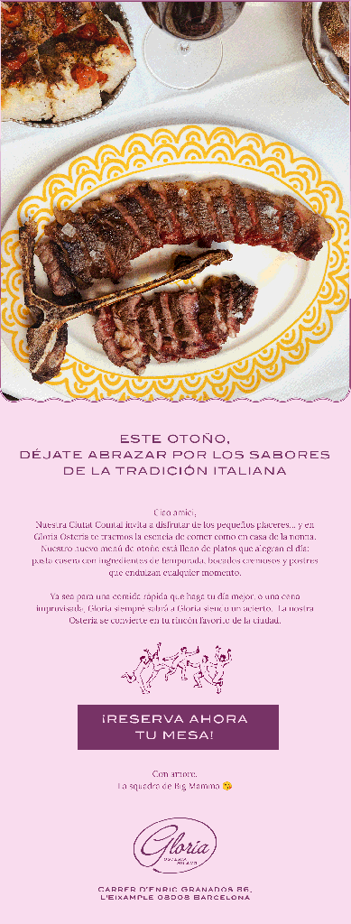 y con él, los nuevos sabores de Gloria Osteria (Carrer d’Enric Granados, 86). El restaurante más glamurosamente italiano de Barcelona estrena menú de otoño: una propuesta cálida, generosa y hecha para disfrutar sin prisa, en el corazón del