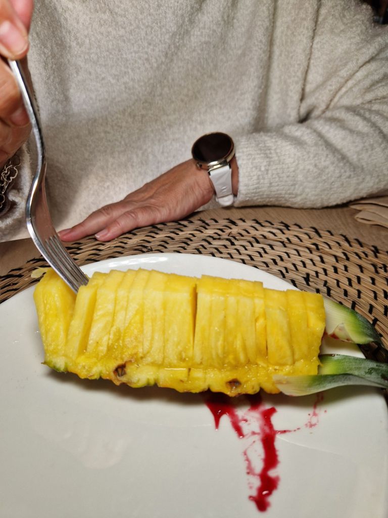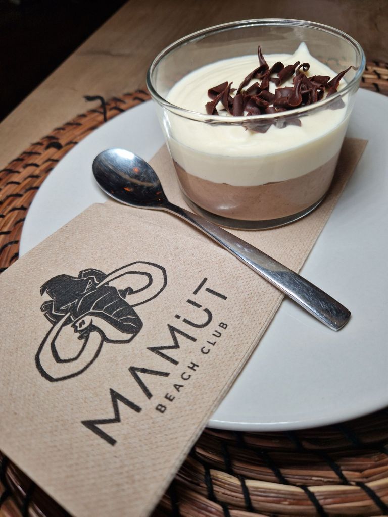 De postres nos decidimos por un Mousse de dos chocolates “magnífico” y fruta del tiempo para finalitzar este estupendo Menú Calçotada del Mamut Beach Club