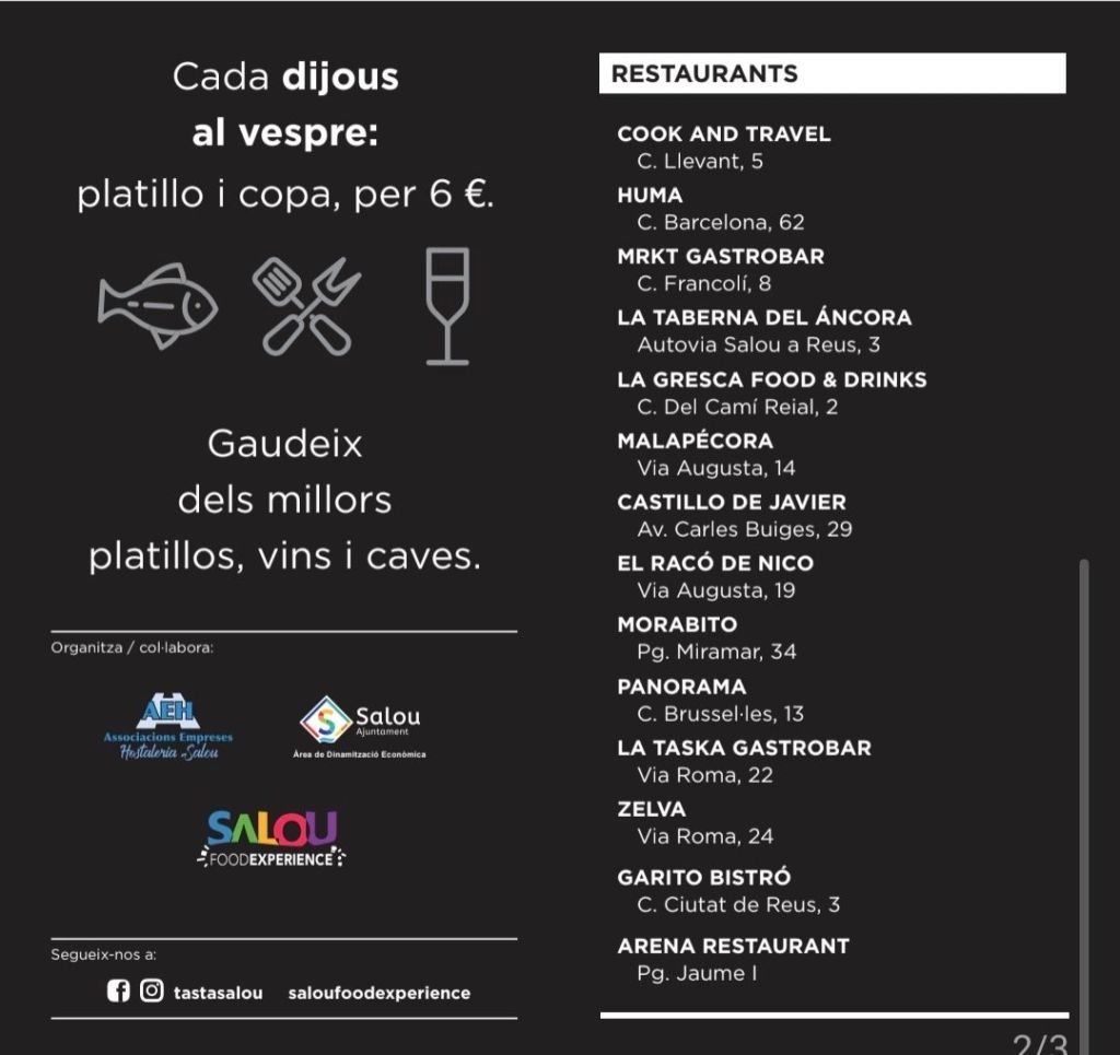 Cook&Travel, Huma, MRKT Gastrobar, La Taberna del Áncora, La Gresca Food&Drinks, Malapécora, Castillo de Javier, El Racó de Nico, Morabito, Panorama, La Taska Gastrobar, Zelva, Garito Bistró i Arena Restaurant.
