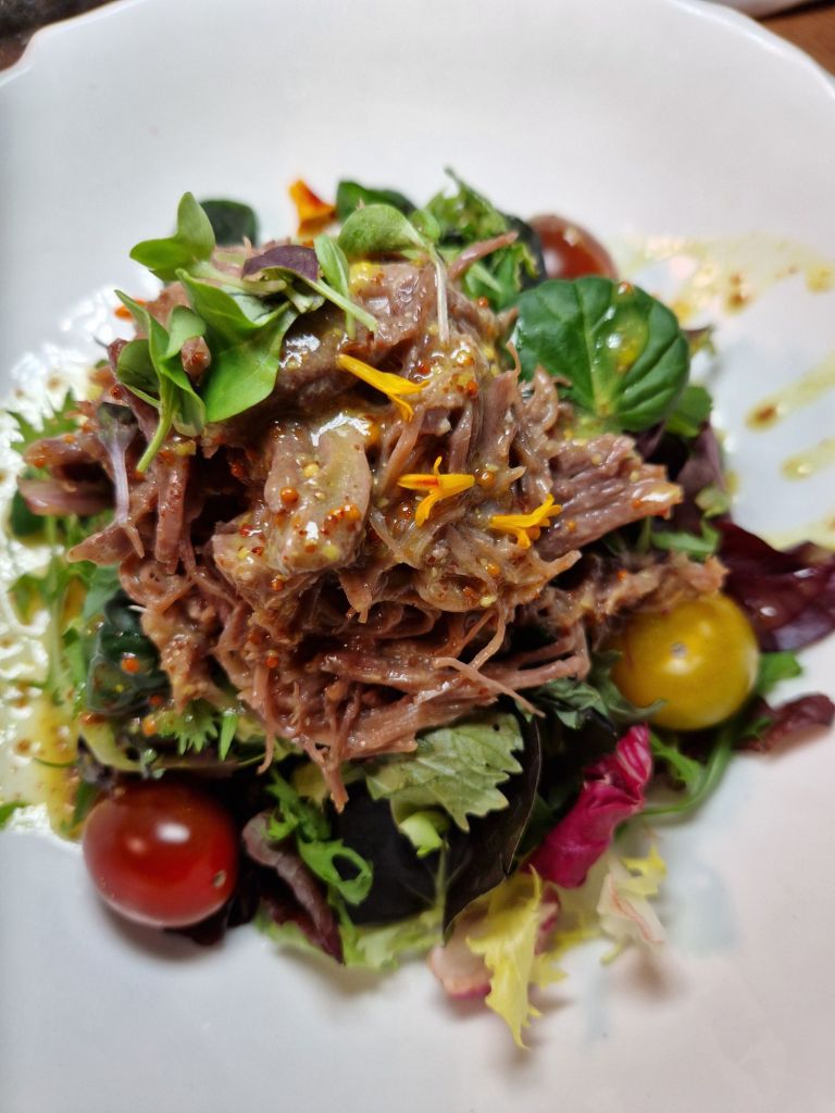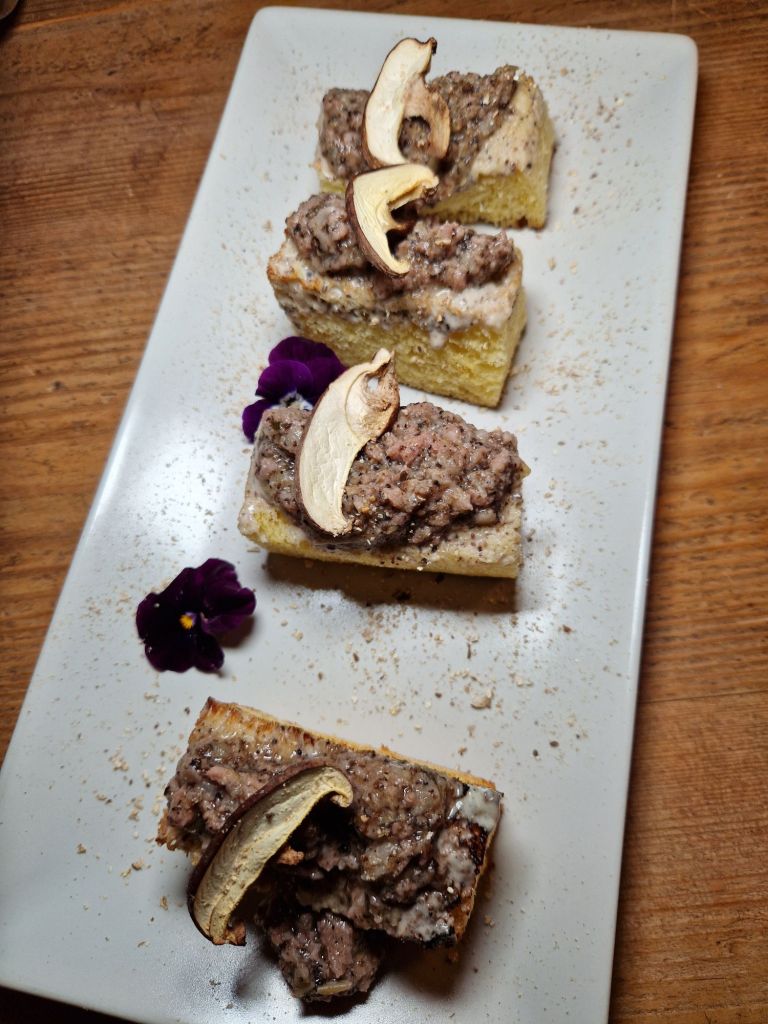cuina de bosc i l’ús ancestral d’embotits i fongs; l’amanida d’ànec amb vinagreta de