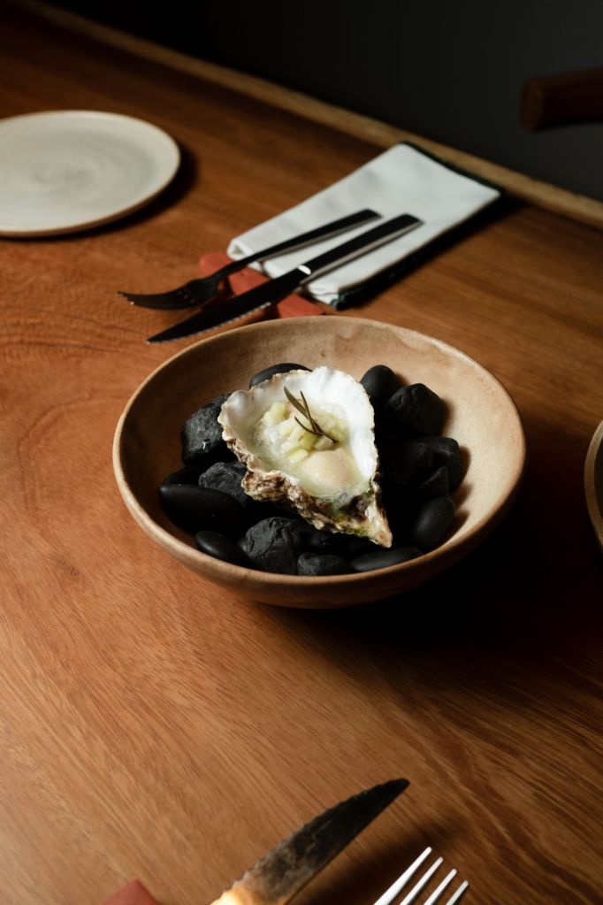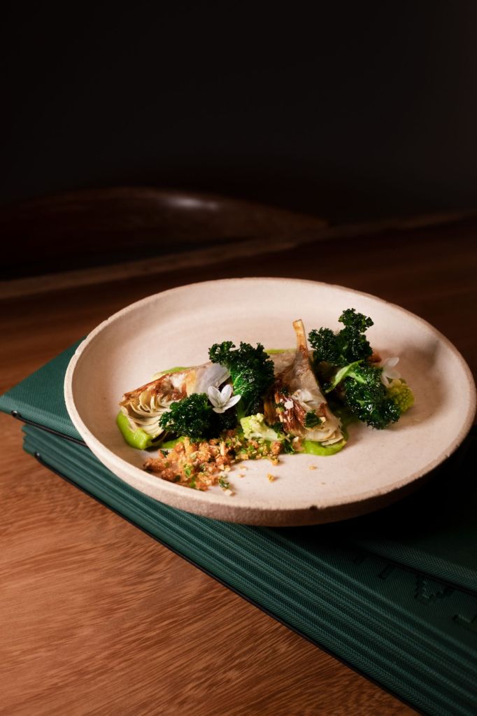Els colors de la temporada es combinen amb el pa del Colmado Puntal i diversos aperitius de benvinguda que es renoven setmanalment. La proposta comença amb una amanida d’hivern que barreja carxofa, crema de calçots i kale, acompanyada d’un brou de verdura i miso de pa. El peix protagonista és la ratlla, present en aigües mediterrànies i atlàntiques, servida amb salsa verda, tàperes fregides i fonoll. Com a plat principal, un arròs melós de mar i muntanya precedeix al fricandó de cérvol, que tanca la part salada del menú.