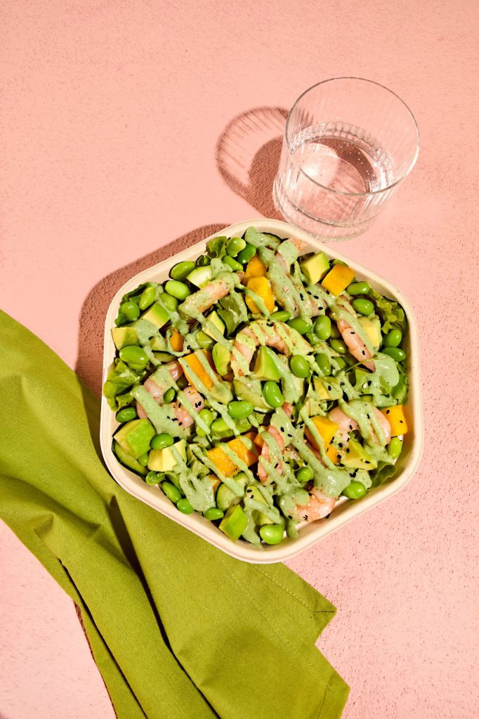Por último, la Lime & Mango Shrimp: Una ensalada fresca y vibrante que combina gambas con lima y tomillo con mango, aguacate, pepino y edamame sobre una base de ensalada aliñada con aceite y sal.